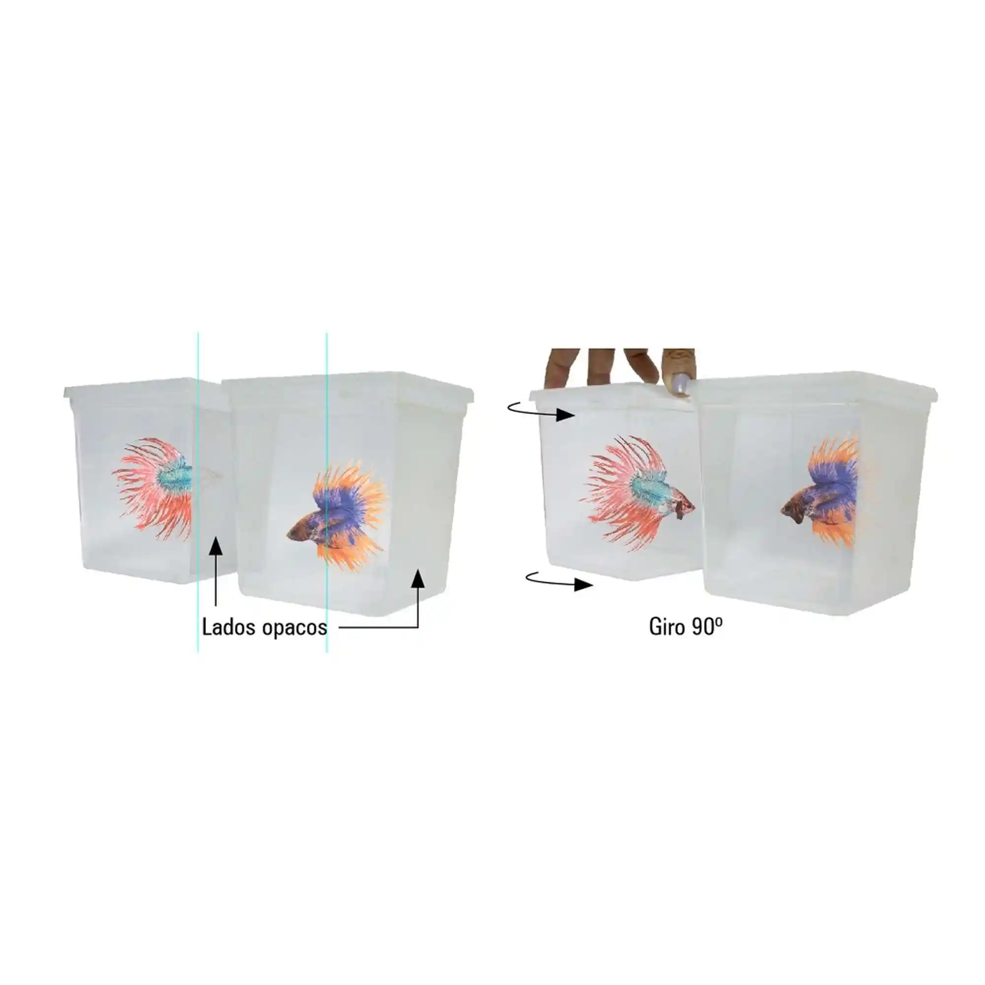 • La Betera plástica de 0.75L de capacidad, posee un lado opaco que evita el que se puedan ver sus Bettas vecinos. Para que sus Bettas luzcan todo su color, y sus aletas completamente abiertas y en todo su esplendor, gire una de las dos Beteras 90º para que se vean y muestren su atractivo, defendiendo su territorio. No debe dejarlos así más de uno o dos minutos, pues el estrés los cansa y debilita, haciéndolos más propensos a enfermedades.